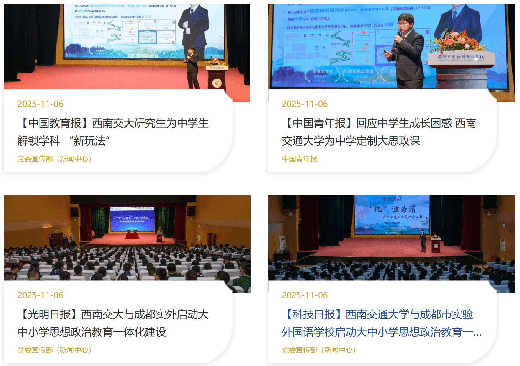 近日,西南交通大学与成都市实验外国语学校签署合作备忘录,正式启动大中小学思想政治教育一体化建设项目。我校党委副书记高平平出席活动并为共建基地揭牌。