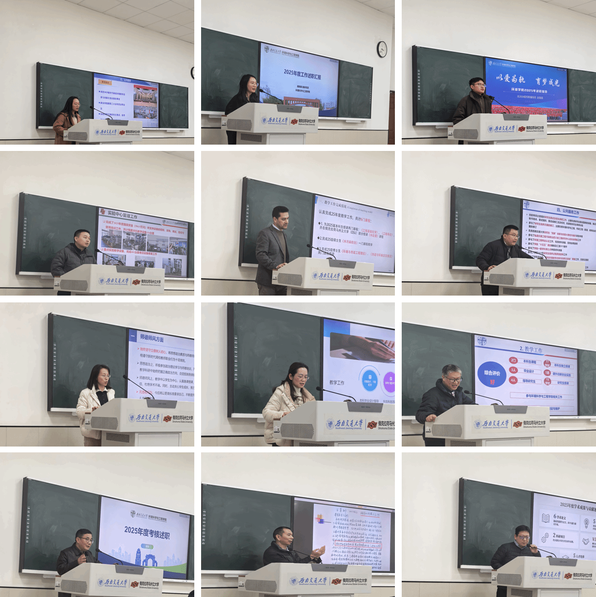 会上,全体教职工依次述职,聚焦教育教学、科研进展、公共服务三大板块,全面复盘全年工作成效。述职过程中,资深教师结合教学经验,分享了课堂管理的宝贵心得与学生反馈的优化思路;青年教师则围绕科研工作,畅谈实践感悟与职业思考,同时亮出新版专著高级别论文与项目等科研成果,展现出蓬勃向上的奋进姿态;行政管理与辅导员岗位聚焦专项工作与服务育人实效,系统梳理了师生服务保障、管理流程优化及学生成长支持等方面的创新举措与实际成效。